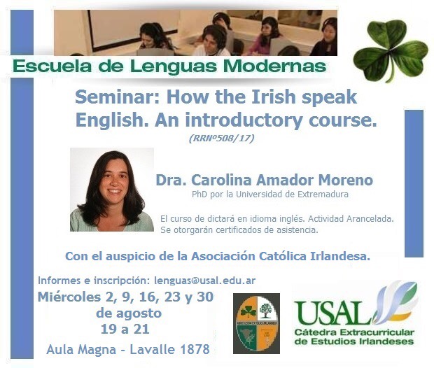 El curso tiene por objetivo introducir a los participantes en la variedad de inglés de Irlanda. Si bien el enfoque será eminentemente lingüístico, el material que se analizará como parte de este curso resultará relevante para todo aquel que se interese en el uso de la lengua inglesa en Irlanda, desde una perspectiva literaria, histórica, geográfica, socio-lingüística o cultural.