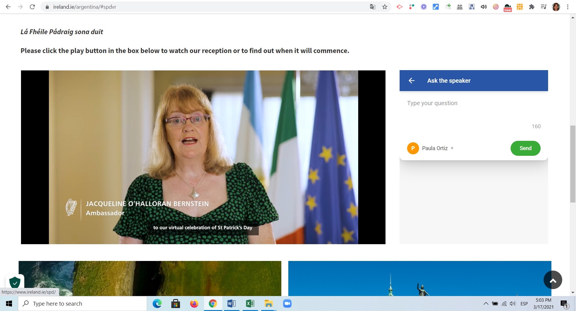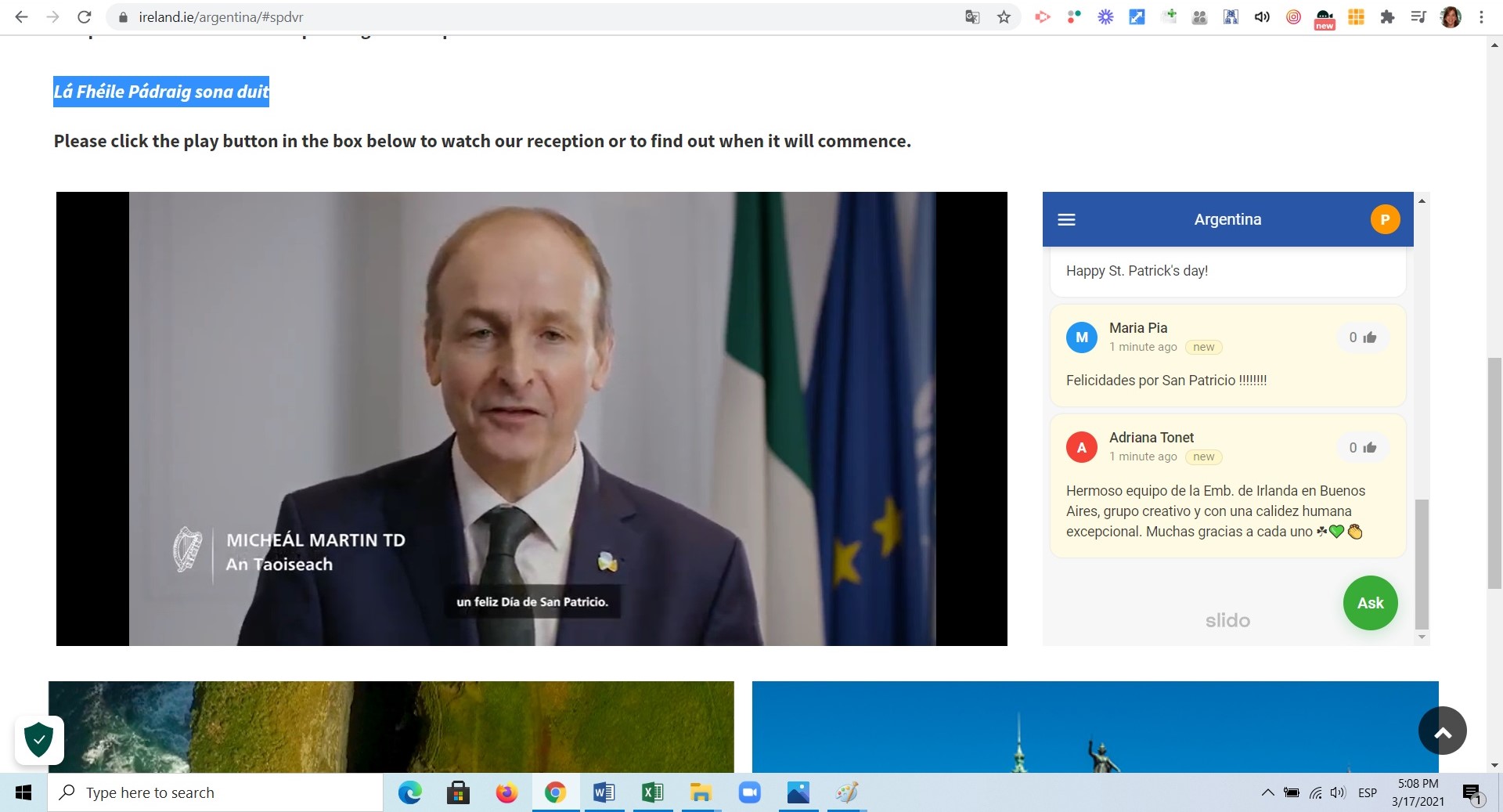 En el marco de las celebraciones del Día de San Patricio, Fiesta Nacional de Irlanda, participamos de la recepción virtual ofrecida por la Embajadora de Irlanda, S.E. Da. Jacqueline O’Halloran Bernstein. Micheál Martin, Taoiseach de Irlanda, tal como se denomina en ese país al primer ministro, brindó unas cálidas palabras dirigidas a la comunidad irlando-argentina, en tiempos de