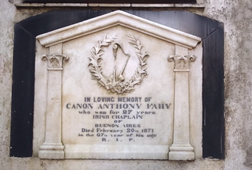 Esa fue la primera que se colocó. Debajo de una ventana se encuentra la lápida que acompaña esta nota y dice: “En recuerdo cariñoso del Canon Antonio Fahy que fue por 27 años capellán irlandés de Buenos Aires. Murió el 20 de febrero de 1871 a los 67 años. RIP”.