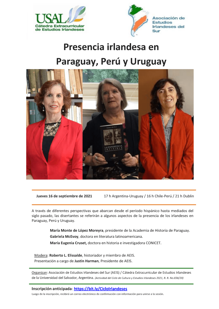 A través de diferentes perspectivas que abarcan desde el período hispánico hasta mediados del siglo pasado, las disertantes se referirán a algunos aspectos de la presencia de los irlandeses en Paraguay, Perú y Uruguay.