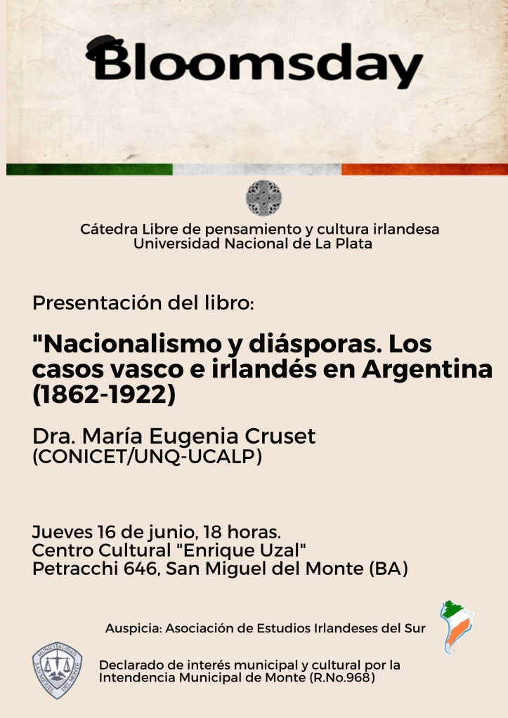 La Cátedra Libre de pensamiento y cultura irlandesa de la Universidad Nacional de La Plata invita a la presentación del libro: “Nacionalismo y diásporas. Los casos vasco e irlandés en Argentina (1862 – 1922)”, a cargo de su autora, Dra. María Eugenia Cruset* (CONICET/UNQ-UCALP).