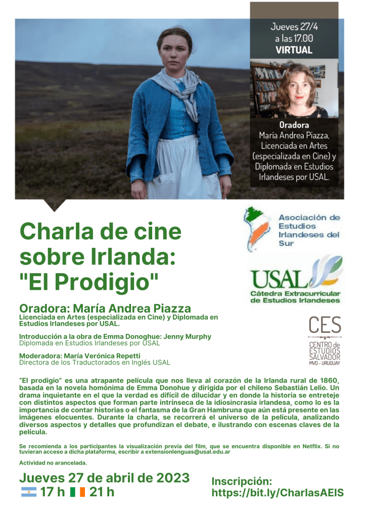 “El prodigio” es una atrapante película que nos lleva al corazón de la Irlanda rural de 1860, basada en la novela homónima de Emma Donohue y dirigida por el chileno Sebastián Lelio. Un drama inquietante en el que la verdad es difícil de dilucidar y en donde la historia se entreteje con distintos aspectos que forman parte intrínseca de la idiosincrasia irlandesa, como lo es la importancia de contar historias o el fantasma de la Gran Hambruna que aún está presente en las imágenes elocuentes. Durante la charla, se recorrerá el universo de la película, analizando diversos aspectos y detalles que profundizan el debate, e ilustrando con escenas claves de la película.