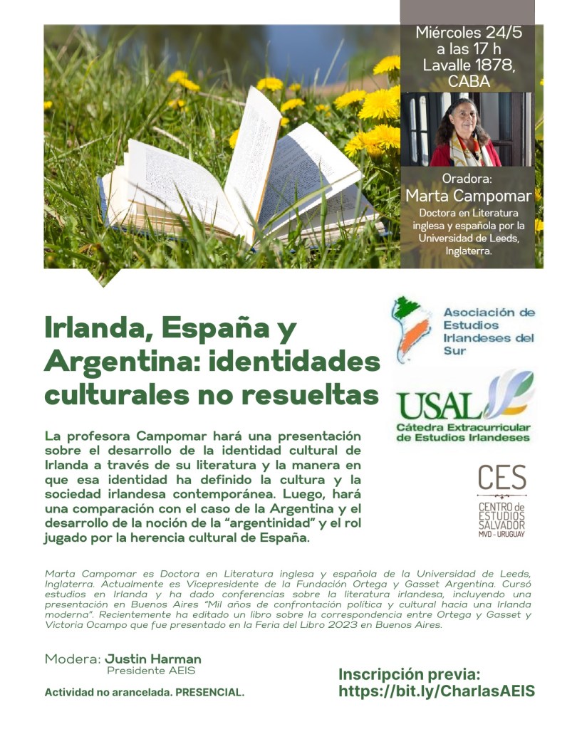 La profesora Campomar hará una presentación sobre el desarrollo de la identidad cultural de Irlanda a través de su literatura y la manera en que esa identidad ha definido la cultura y la sociedad irlandesa contemporánea. Después hará una comparación con el caso de la Argentina y el desarrollo de la noción de la “argentinidad” y el rol jugado por la herencia cultural de España.