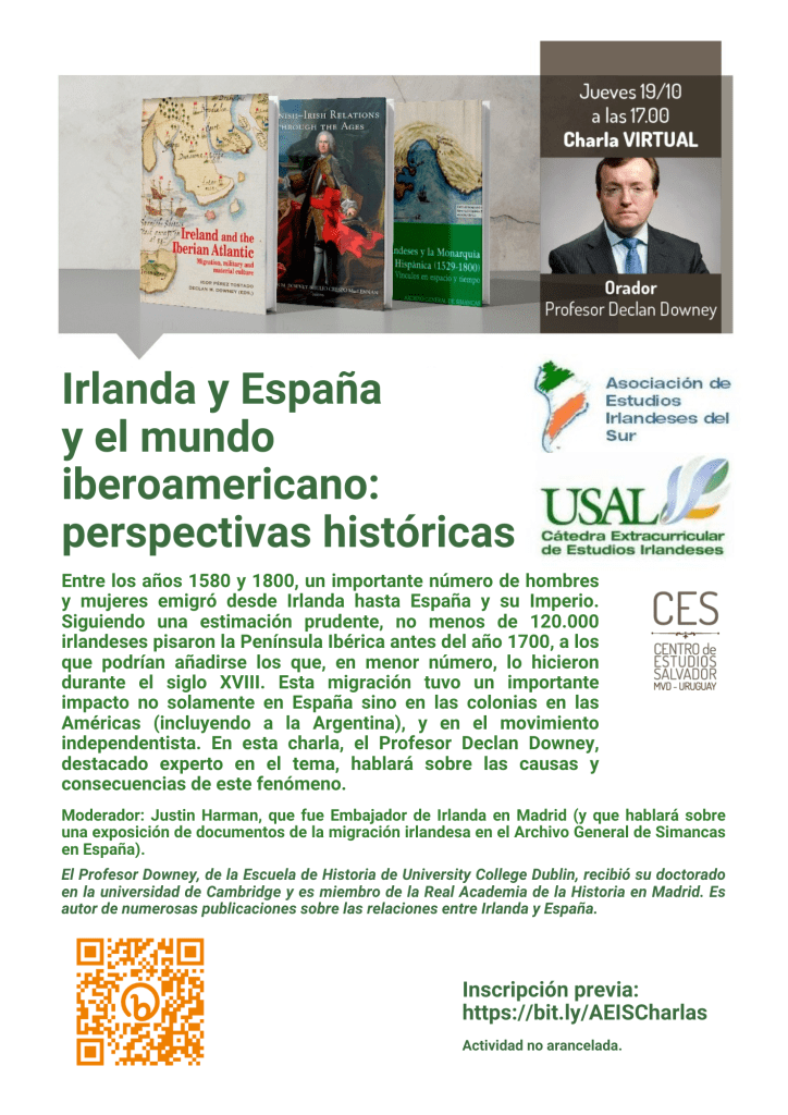 En esta charla, el Profesor Declan Downey, destacado experto en el tema, hablará sobre las causas y consecuencias de este fenómeno. Downey, de la Escuela de Historia de University College Dublin, recibió su doctorado en la universidad de Cambridge y es miembro de la Real Academia de la Historia en Madrid. Es autor de numerosas publicaciones sobre las relaciones entre Irlanda y España.