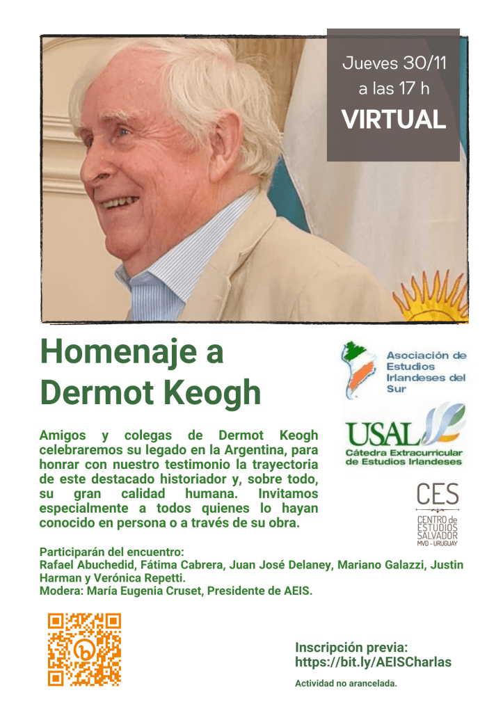 Amigos y colegas de Dermot Keogh celebraremos su legado en la Argentina, para honrar con nuestro testimonio la trayectoria de este destacado historiador y, sobre todo, su gran calidad humana. Invitamos especialmente a todos quienes lo hayan conocido en persona o a través de su obra.