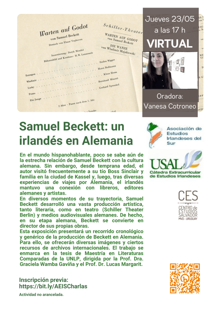 Esta exposición presentará un recorrido cronológico y genérico de la producción de Beckett en Alemania. Para ello, se ofrecerán diversas imágenes y ciertos recursos de archivos internacionales. El trabajo se enmarca en la tesis de Maestría en Literaturas Comparadas de la UNLP, dirigida por la Prof. Dra. Graciela Wamba Gaviña y el Prof. Dr. Lucas Margarit.