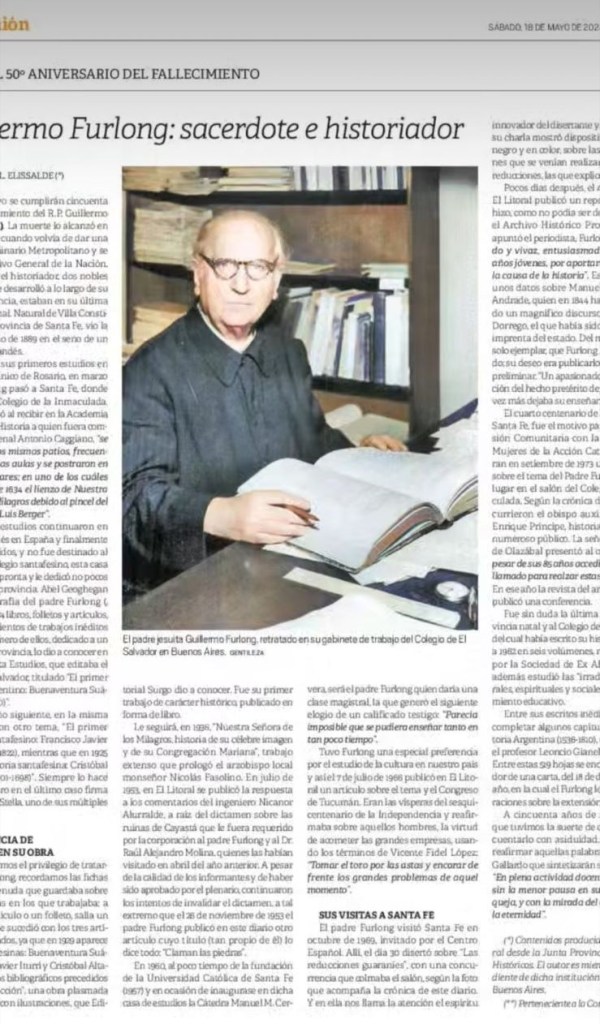 El 20 de mayo se cumplirán cincuenta años del fallecimiento del R.P. Guillermo Furlong S.J. (**). La muerte lo alcanzó en el subterráneo cuando volvía de dar una clase en el Seminario Metropolitano y se dirigía al Archivo General de la Nación. El sacerdote y el historiador, dos nobles actividades que desarrolló a lo largo de su fecunda existencia, estaban en su última actividad terrenal. Natural de Villa Constitución, en la provincia de Santa Fe, vio la luz el 21 de junio de 1889 en el seno de un matrimonio irlandés.
