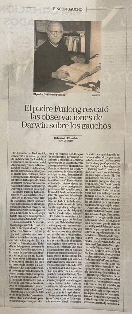 El R.P. Guillermo Furlong S.J., concurrió a la sesión privada de la Academia Nacional de la Historia en su nueva sede del Antiguo Congreso de la Nación. Llevaba más de tres décadas y media ocupando ese sitial, y era el cuarto académico en orden de precedencia; disciplinado y laborioso, había pedido el uso la palabra para leer una comunicación titulada: “Cómo juzgó Darwin a nuestros gauchos”.