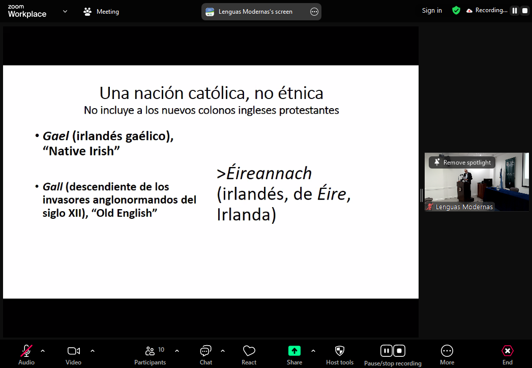 El miércoles 6 de noviembre, el profesor invitado Diarmuid Ó Giolláin brindó una conferencia titulada «Argentina e Irlanda: una comparación desde una perspectiva cultural/histórica», en español. La visita del profesor Ó Giolláin a la Argentina y a nuestra universidad se enmarca en la Diplomatura en Estudios Irlandeses de la Escuela de Lenguas Modernas, a través del Emigrant Support Program (ESP) del Gobierno de Irlanda para el apoyo de la difusión de los estudios y la cultura irlandeses en América Latina.
