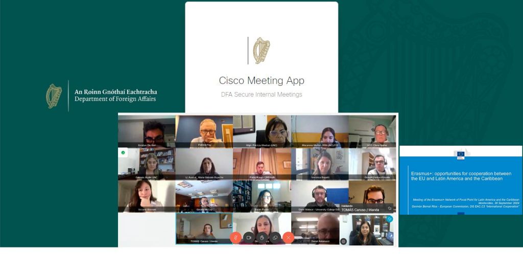 Una de las herramientas más importantes para promover convenios y fortalecer actividades conjuntas es el programa Erasmus+ de la Unión Europea. Por ello, después de las palabras introductorias del Embajador de Irlanda en Argentina, Gerard McCoy, y de la Embajadora de Argentina en Irlanda, Ana Laura Cachaza, la asesora de cooperación internacional en la Delegación de la Unión Europea en Argentina, Victoria Giussani, expuso sobre el programa de movilidad internacional de créditos, con intervenciones de Nuria Pazos, responsable del Punto Focal Nacional Erasmus+ de la Unión Europea en Argentina. Acompañaron Agostina Salvaggio y Nicolás Vidal, por la Embajada de Argentina en Irlanda, con la coordinación general del encuentro por parte de Tomás Caruso Beltran, funcionario de la Embajada de Irlanda en Argentina.