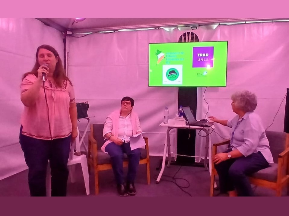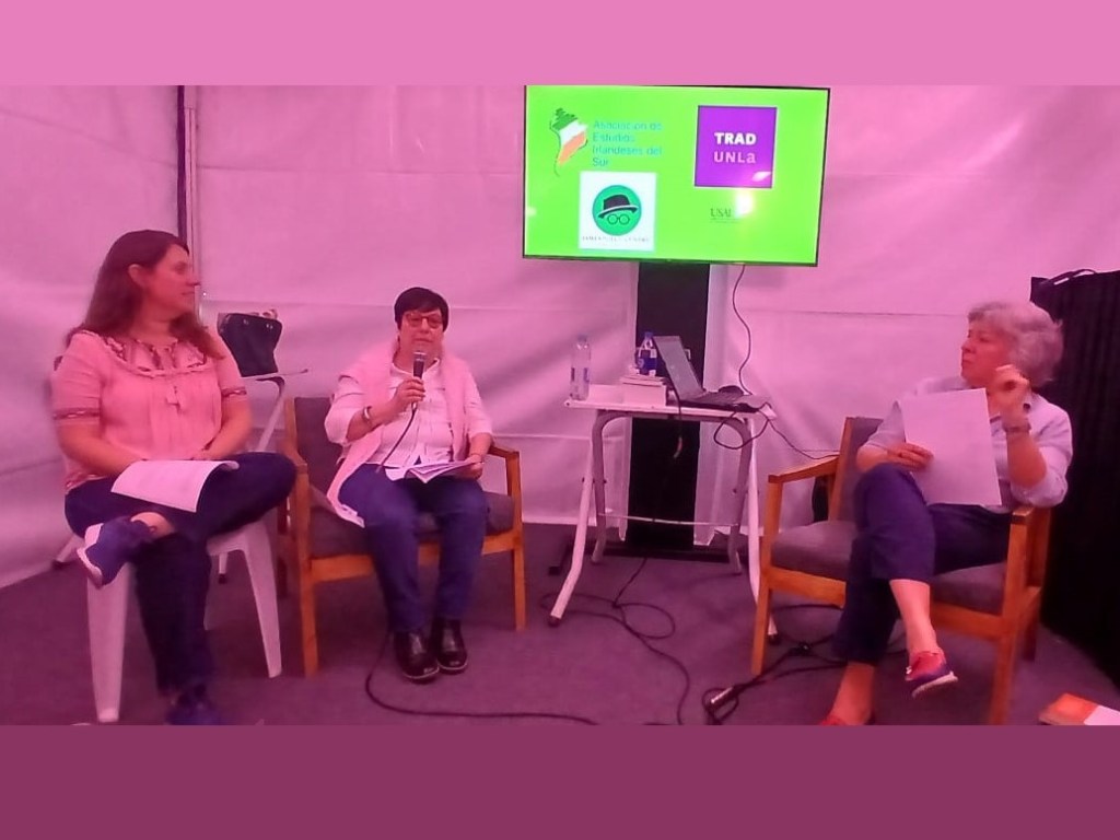 El sábado 4 de octubre, invitadas por la Embajada de Irlanda en Argentina a través de AEIS, las profesoras Mónica Cuello, Viviana Keegan y Verónica Repetti participaron de la FILAB (Feria del Libro de Almirante Brown). La prof. Cuello, diplomada en Estudios Irlandeses por la USAL y coordinadora de los estudios irlandeses que se llevan adelante en UNLa, trazó un recorrido por la literatura irlandesa en el último siglo y por las traducciones al español disponibles en Argentina de obras de autores irlandeses. A continuación, la prof. Repetti se refirió a las actividades que se realizan bajo el marco de la AEIS y luego cedió la palabra a la prof. Keegan, co-titular de la Diplomatura en Estudios Irlandeses de la USAL, quien se refirió a las oportunidades que brinda dicha titulación.