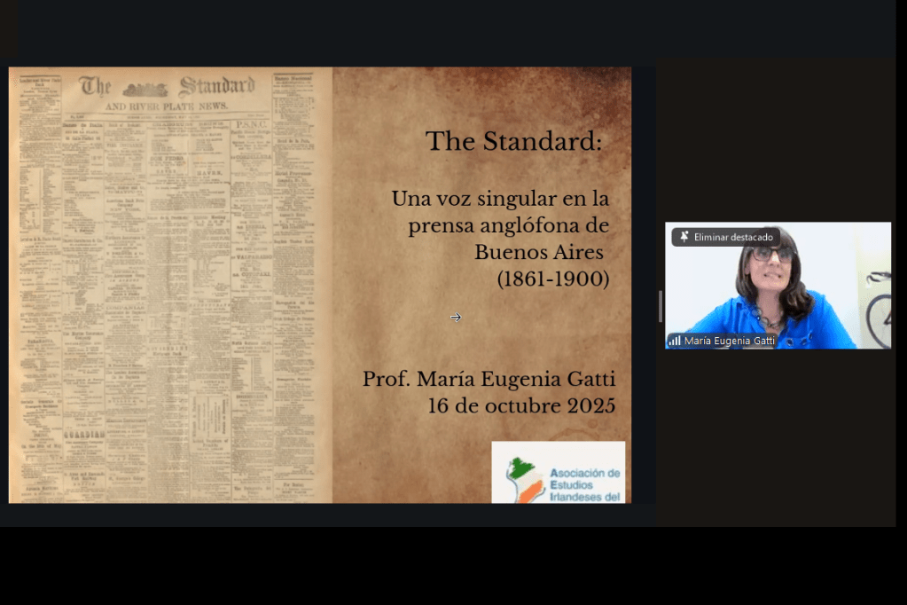 El jueves 16 de octubre se llevó a cabo la charla «The Standard una voz singular en la prensa anglófona de Buenos Aires (1861-1900)», a cargo de la Prof. María Eugenia Gatti, co-organizada con la Asociación de Estudios Irlandeses del Sur (AEIS), con la moderación de la Trad. Verónica Repetti (USAL/AEIS).